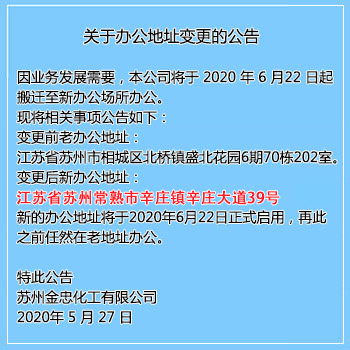 蘇州金忠化工有限公司成立于1995年元月,位于人杰地靈、山清水秀的蘇州市相城區(qū)。而生產(chǎn)工廠則位于國家級化工園區(qū)-蘇州常熟市新材料產(chǎn)業(yè)園區(qū)。 園區(qū)水、電、汽設(shè)備配套齊全。生產(chǎn)工廠占地面積70,000m2,擁有標(biāo)準(zhǔn)廠房50,000m2,2002年通過了ISO9001國際質(zhì)量體系認證。